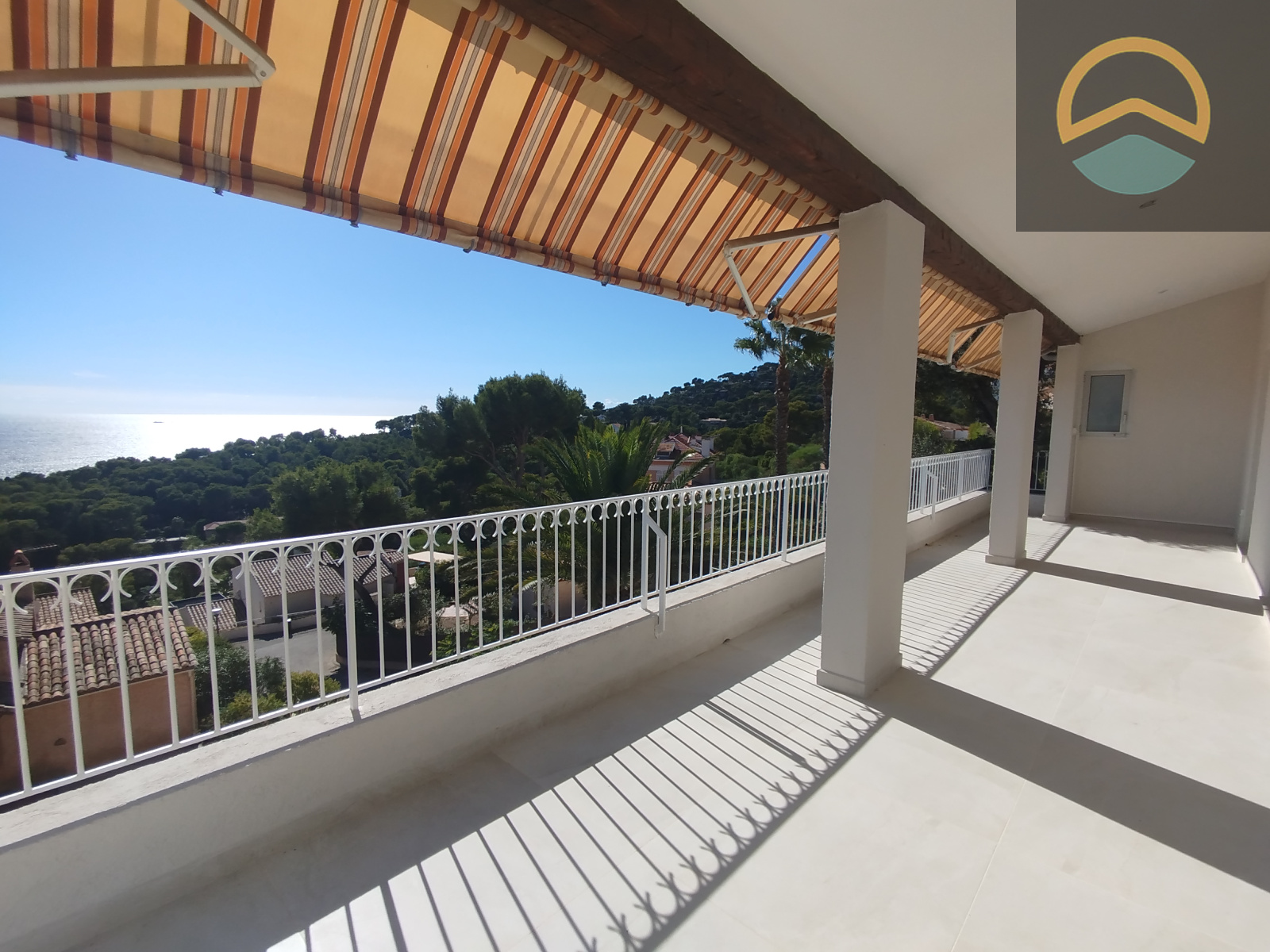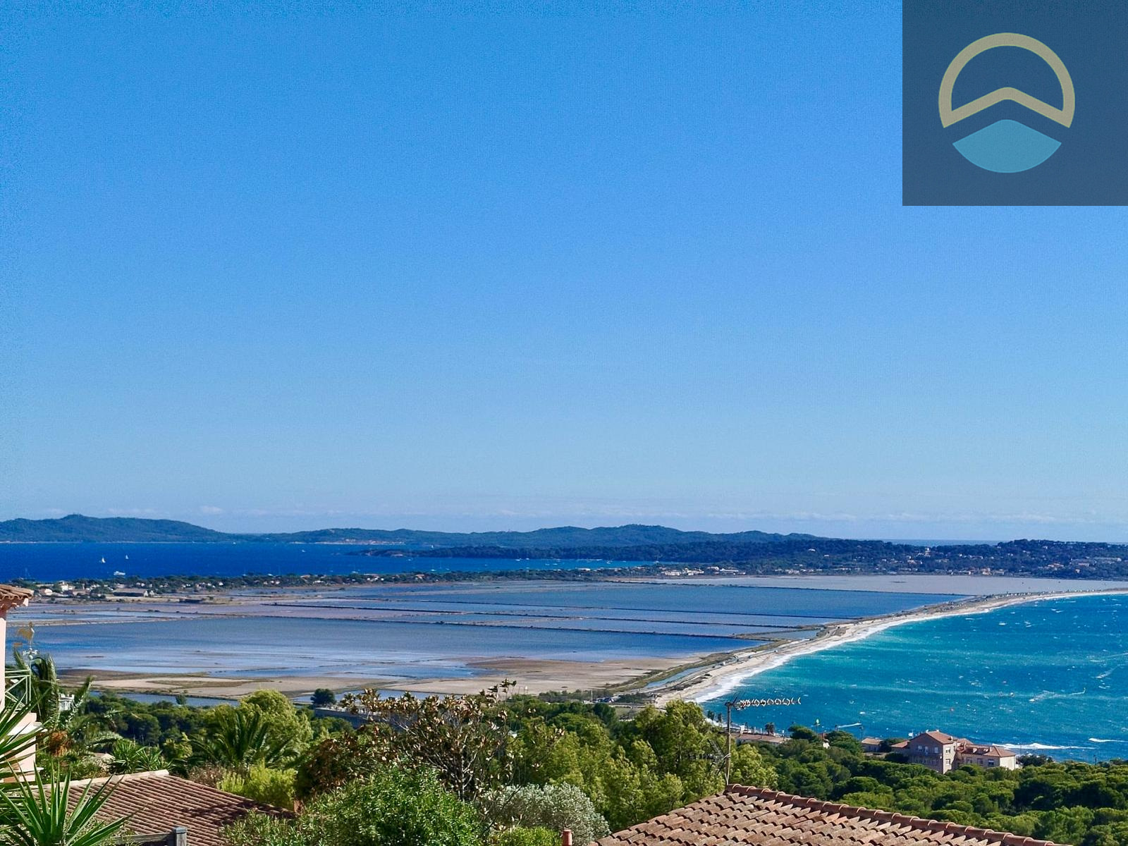 Située dans le domaine sécurisé du Mont des Oiseaux à Hyères Les Palmiers, venez découvrir cette villa rénovée avec son exceptionnelle vue à 360° sur le double Tombolo de L'Almanarre, porquerolles, les salins, Giens et la Madrague.
